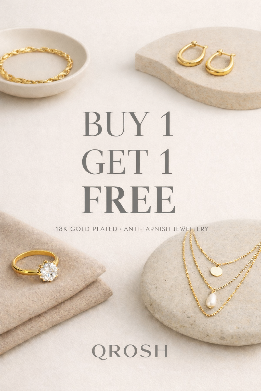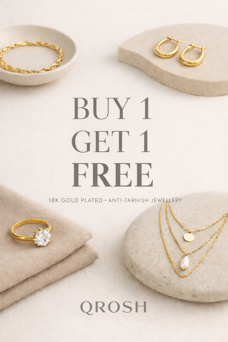 Welcome to QROSH, where modern and timeless style meet durability with tarnish-free shine. Our jewellery is 18K gold plated and made from 316L premium grade stainless steel. We promise long-lasting brilliance, water-resistance, and hypoallergenic comfort. Whether it’s a power meeting or an evening soirée, your jewellery is always ready.